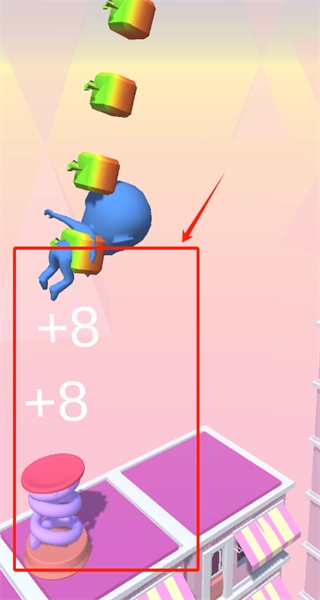 找准时机踩下弹簧起跳,持续撞击悬浮在空中的彩虹球,就能触发每次获得8分的奖励机制啦。