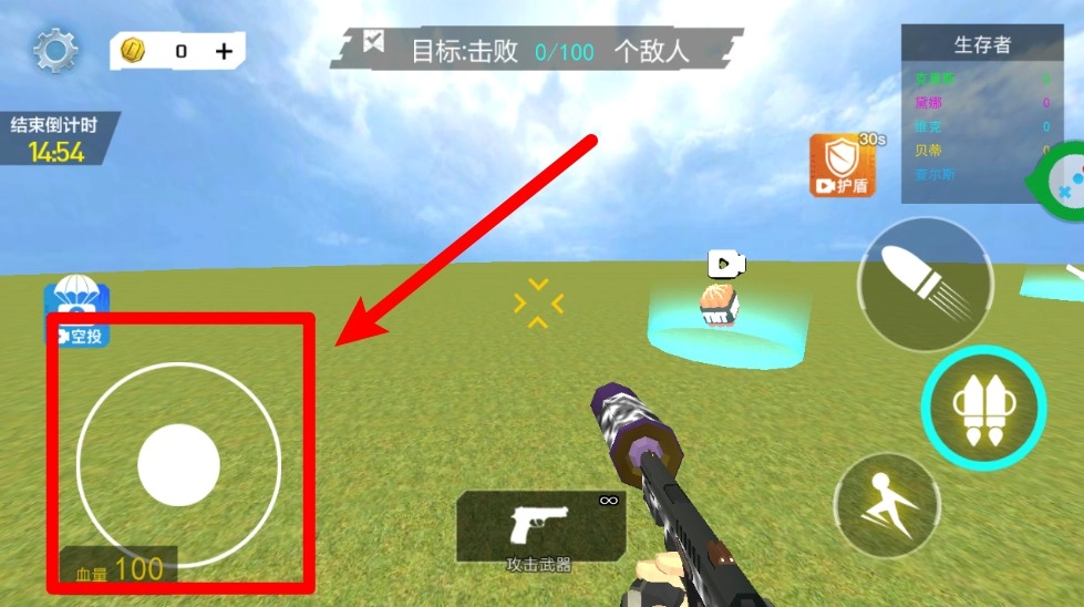 2. 左下角的圆形控制区域是虚拟摇杆,能够用来操控角色进行自由移动以及规避敌人的攻击。