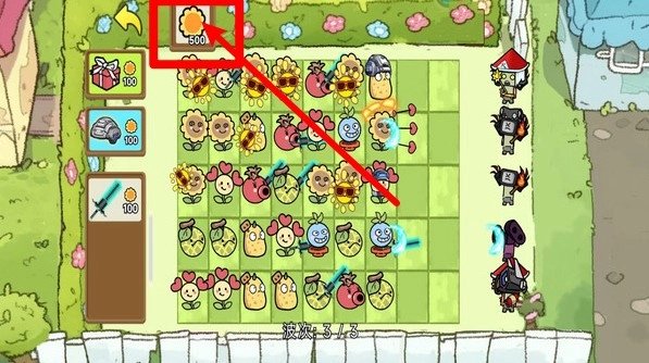 2. 阳光资源的运用:界面上方的阳光数值显示当前可使用的资源量,拥有的阳光越多,就能种植更高级的植物,布局策略也会更加灵活。