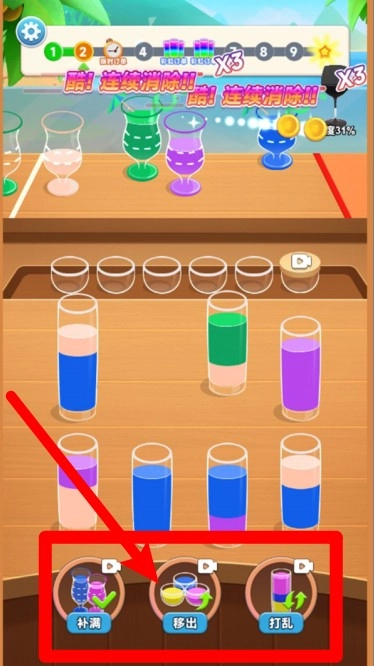 3. 补满、移出和打乱这三个功能设置在底部区域,需要通过观看广告来激活使用,它们能在关键时候帮助玩家突破卡关困境,顺利完成关卡。