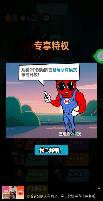 进入游戏后,建议先观看两个广告来解锁所有游戏模式。