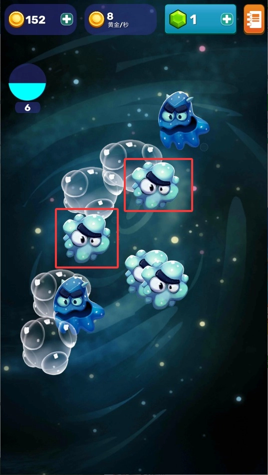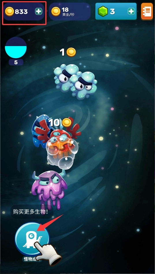2、把两个等级相同的生物朝着相反方向滑动,当它们成功碰撞后,就能合成为更高阶的形态,而且每次进化都能让金币的产出效率得到提升。