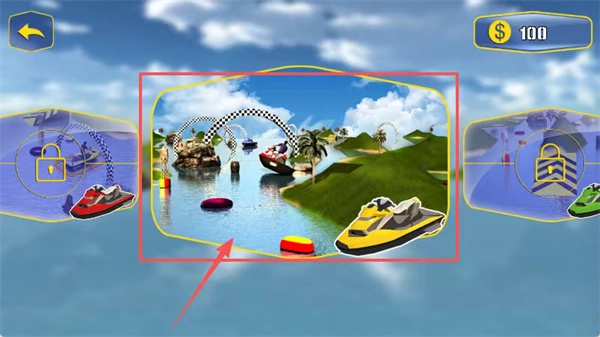 在游戏界面里,注意观察水域中央的摩托艇,同时留意红、黄、黑三种浮标和拱门,还有左右锁定区域内的摩托艇。