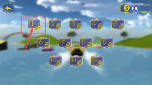 进入驾驶界面后,留意前方带有格子图案的拱门,通过右下角的蓝色操控面板,点击数字1对应的按钮来操控摩托艇向前行驶。