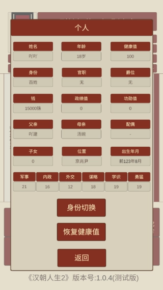 《汉朝人生2》是一款以西汉王朝为时代背景的历史题材文字模拟经营游戏。玩家将从一介布衣开始,亲身经历从汉初到王朝鼎盛时期的百年风云变幻。游戏巧妙融合了角色养成、家族经营与策略抉择等核心玩法,玩家可以通过务农积累资源、行商聚拢财富、读书考取功名等多种方式提升自身社会地位,还能将辛苦积累的家业与声望代代传承下去。
