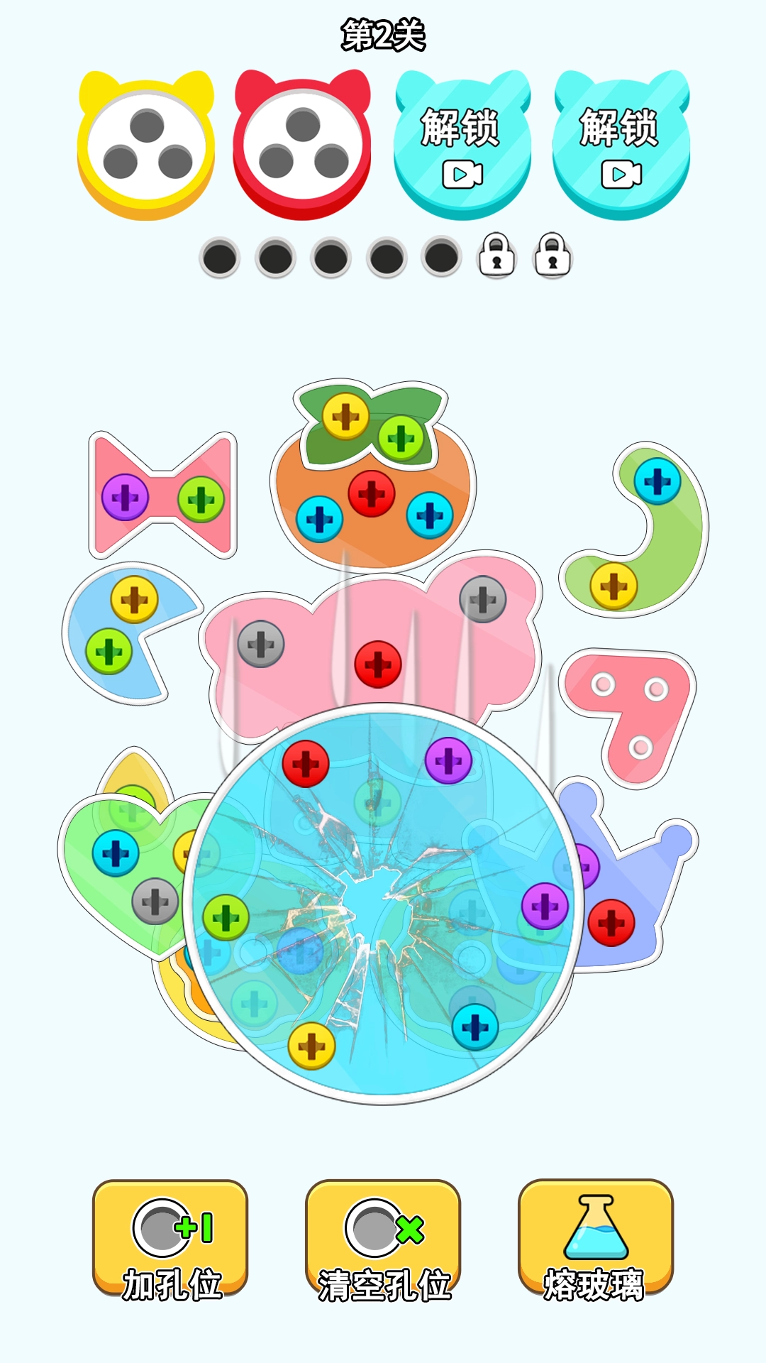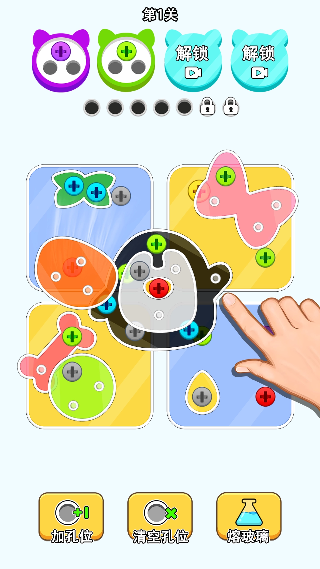 玩家仅需滑动屏幕,把三个及以上相同的螺丝钉或玻璃板连成一条直线,就能完成消除操作。