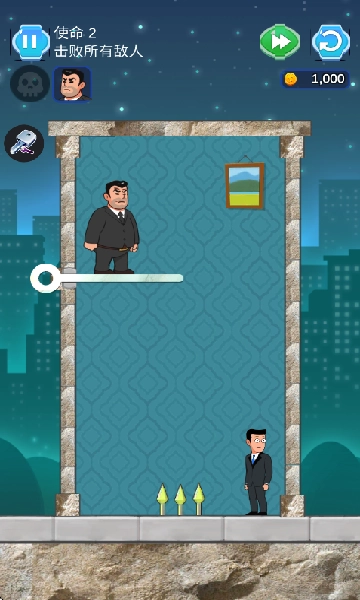 第二关也挺简单的,只要打败这个坏人,再抽出拉针,坏人掉下来踩到针就完蛋了。