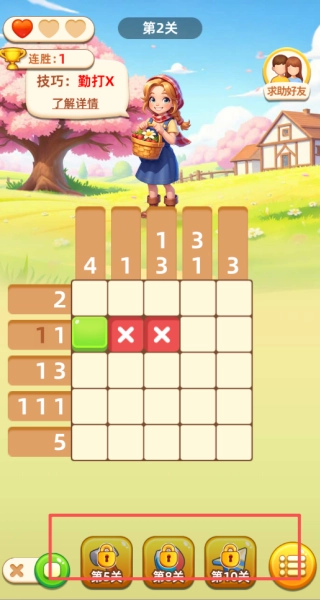 “勤打X”这一技巧适用于排除法,具体是对已确定不符合条件的格子标注X。例如第二关中间区域存在连续两个标有X的格子,借助这一标记能清晰排除错误选项,从而缩小正确数字的范围。