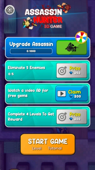 在游戏主界面,玩家既能对角色等级进行升级操作,也能领取完成任务后获得的钻石奖励,点击“start game”按钮就可以开启关卡挑战。