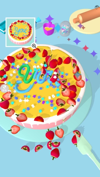 游戏采用直观的触控交互方式,玩家只需用手指滑动就能涂抹奶油,通过捏合缩放功能可灵活调整装饰的摆放位置,还能摇晃设备让糖粉均匀洒落。