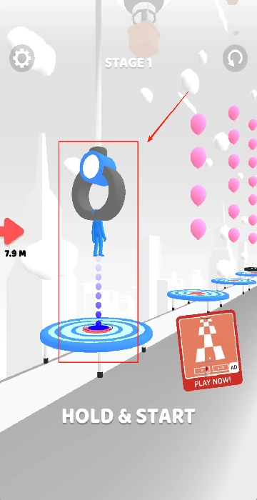 按住屏幕中央的HOLD & START键即可开启游戏,画面中蓝色小人悬挂在蹦床正上方,背景处能看到城市的轮廓与色彩缤纷的气球。