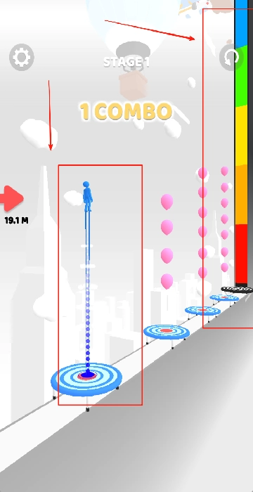 你需要操控蓝色小人借助蹦床起跳,目前高度达到19.1米,右边的彩色能量条会呈现弹跳的力度大小,过程中要躲开白色的障碍物,同时收集粉色的气球。