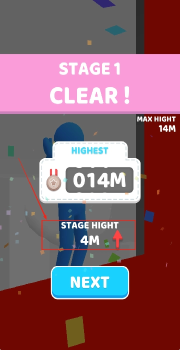 关卡完成时会显示“MAX HIGHT 14米”,点击蓝色的“NEXT”按钮即可进入下一关,此时背景会飘落彩色纸屑来庆祝通关。