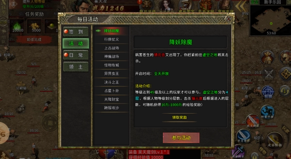 游戏里的活动特别丰富,像降妖除魔、行侠仗义、神魔战场之类的都有,玩家参与这些活动就能拿到不少福利奖励。