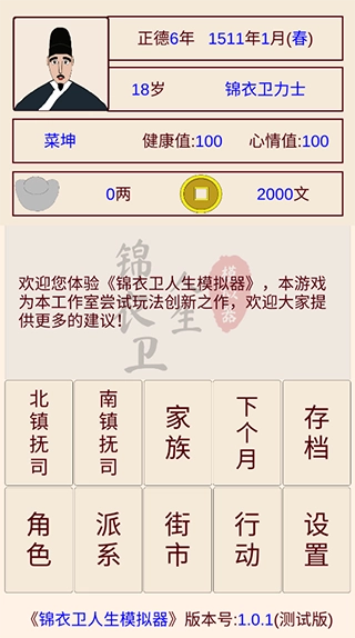 《锦衣卫人生》是一款以明代锦衣卫为背景的文字角色扮演模拟游戏。在游戏中,玩家将化身一名从底层起步的锦衣卫成员,在盘根错节的朝廷派系间周旋。通过完成审讯断案、缉拿重犯、搜集情报等各类任务来积累功勋,亲身经历从普通卫兵逐步晋升至锦衣卫指挥使的完整仕途历程。