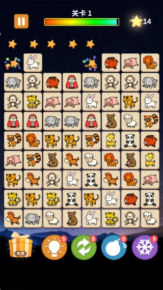 如下图所示,玩家进入第一个关卡后,需要完成的任务是把画面里所有的动物方块进行匹配消除。