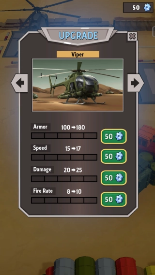 关卡结束后,玩家可以用齿轮提升直升机的各项属性,同时还能解锁更多不同型号的直升机参与战斗!