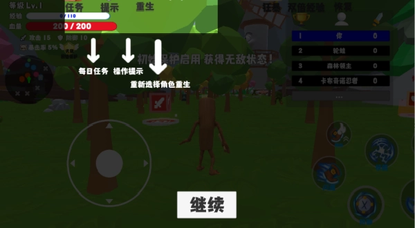 我们还能查看左上方的每日任务和操作提示,也可以选择重生,重生后能够重新选择角色。