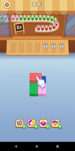进入第一关挑战时,点击画面下方的彩色盒子,把它放到画面上方的平台上,对应颜色的奶茶就会自动装入盒子里。