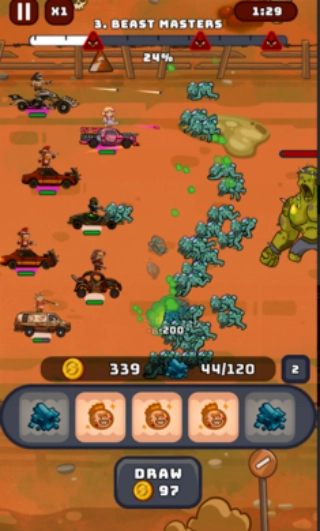 狂暴赛车英雄是一款集赛车驾驶、单位合并与末日生存于一体的快节奏动作策略游戏。玩家将身处一个被僵尸与敌对帮派蹂躏的荒芜世界,驾驶全副武装的战车,驰骋在废墟、沙漠与城市残骸之间,开启一场场充斥着轰鸣与爆炸的生存较量。游戏别出心裁地把合并机制融入赛车战斗,击败敌人后能收集同类战车碎片,三辆相同战车合并可提升等级,解锁更强劲的火力与特殊技能,为末日题材增添了全新的生机与活力。