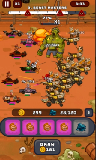 战斗结束后,玩家能够获取金币和核心,这些资源可用于战车的合并、武器的升级,或是在命运之轮里抽取稀有道具与限时强化效果。
