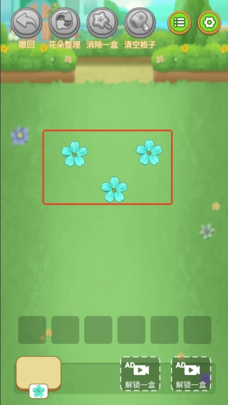 点击三朵一样的蓝色花朵就能完成消除,达到关卡目标后就可以通关。