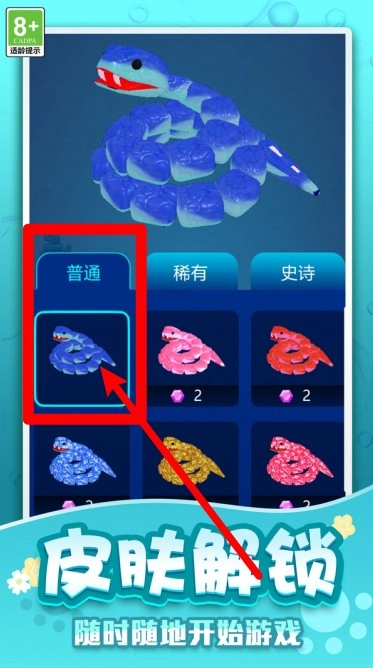 1.皮肤多彩解锁:通过收集宝石进入皮肤库,可在普通稀有史诗三档外观中自由挑选,让你的巨蛇以独特姿态驰骋全场。