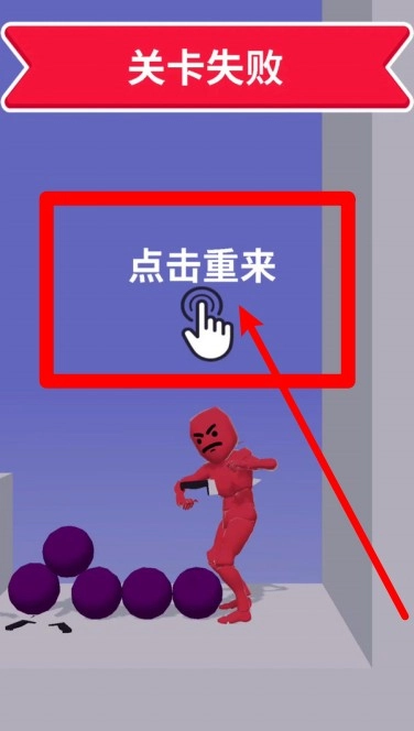 3.失败提示画面:当关卡挑战失败时,屏幕会出现“点击重来”按钮,点击即可快速重新进入对战。