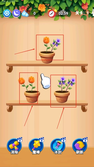 点击两个或以上同色花朵就能消除,滑动屏幕可以旋转花盆视角,便于找到合适位置来操作。