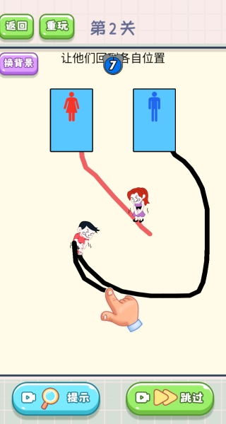 目标是让男生和女生都能回到各自对应的位置上厕所,你需要用单指画线的方式为两人规划出行进的路径。
