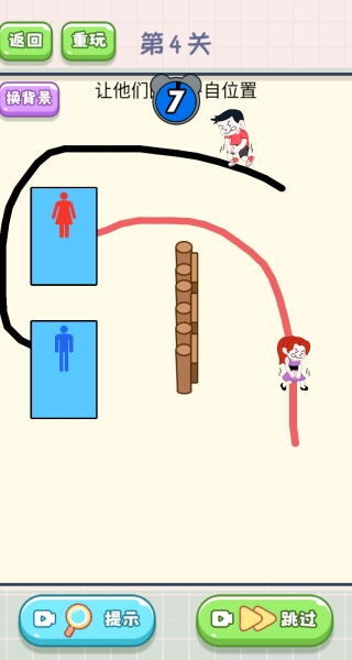 画线时要确保两条路线不重叠,防止角色发生碰撞,让它们都能顺利到达各自对应的厕所位置。