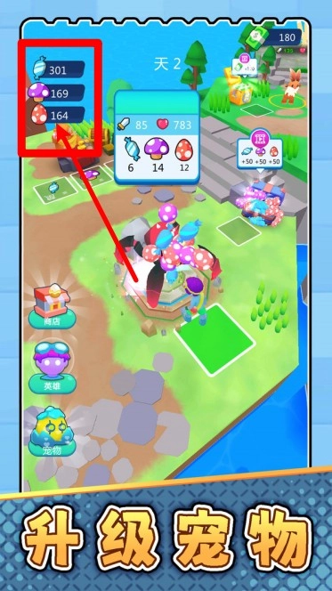 1.资源收集界面:左上角呈现三类关键资源的数量,它们分别作用于宠物捕捉、升级和合成环节,对资源进行合理管控是成长过程中至关重要的基础环节。