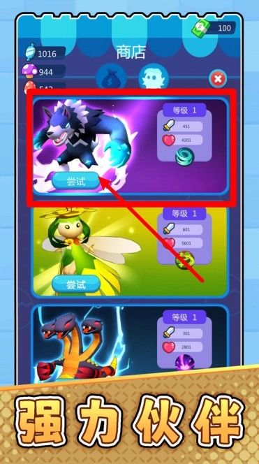 2. 商店试用功能:点击“尝试”按钮即可预览强力宠物的属性,提前知晓其攻击力与生命值情况,便于玩家判断该宠物是否值得投入精力去培养和进行资源投资。