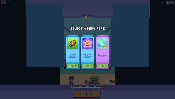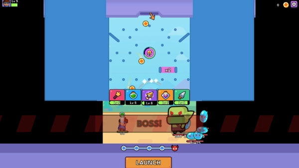 如图所示,点击屏幕下方的“launch”按钮会消耗金币,金币会自上而下掉落,并随机激活各类武器。