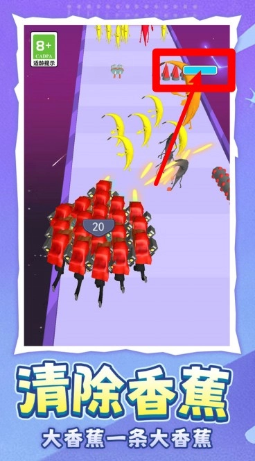 1. 进度条代表敌人的血量,当它被完全填满时,就能瞬间清除前方所有的香蕉怪,游戏节奏非常快。