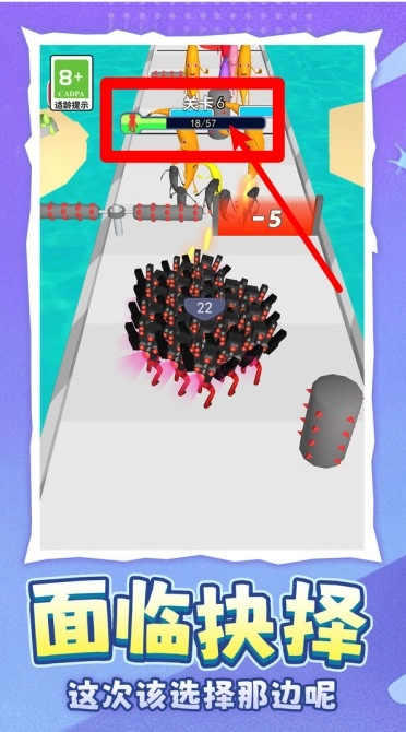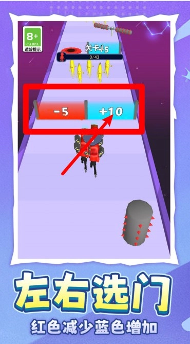 1. 方向由滑动控制:玩家仅需通过滑动操作来控制角色的移动方向,躲避道路上的障碍,并且要优先选择能增加人数和提升攻击力的路线,以此实现快速成长,为迎战终点处的敌人做好准备。