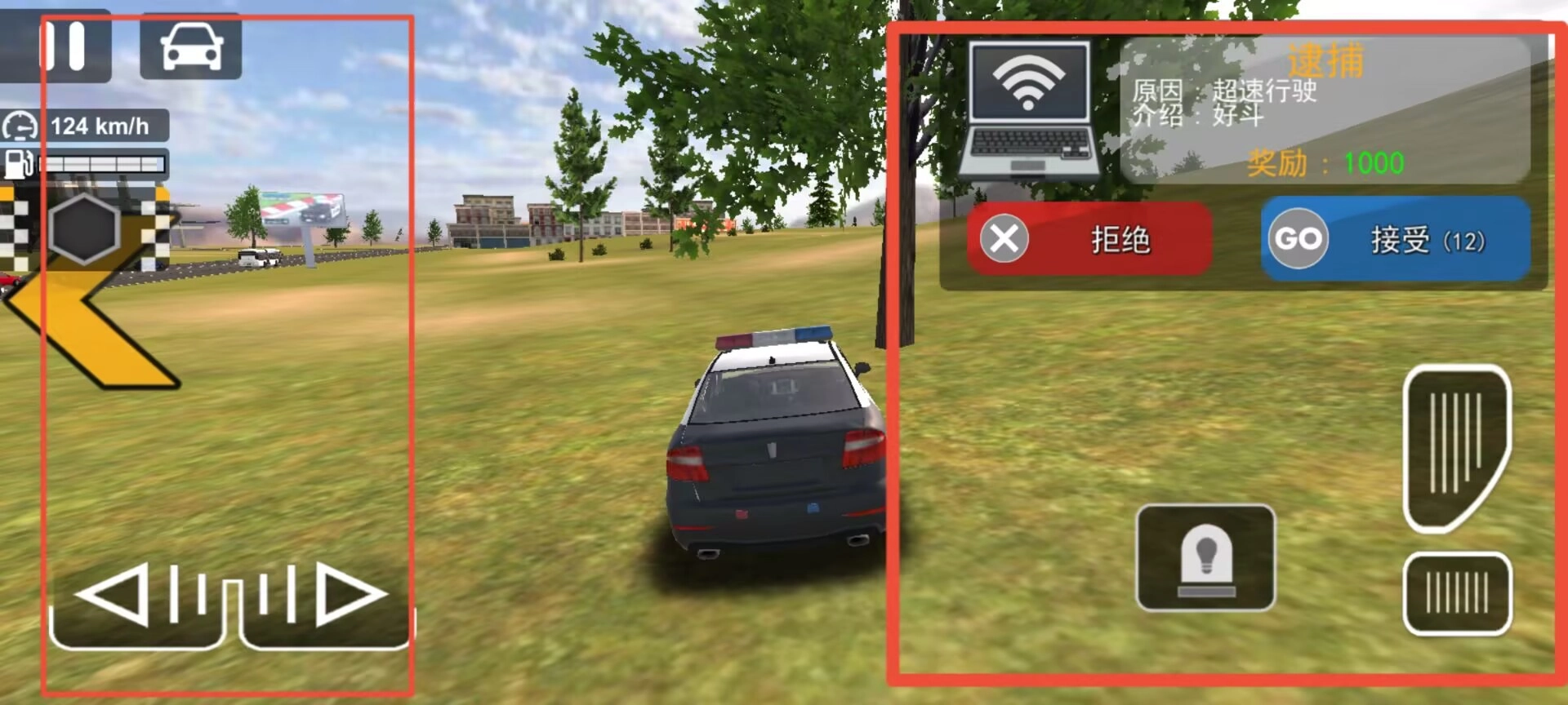 驾驶界面的左侧设有暂停功能按钮和速度仪表,右侧则提供任务接取选项,以及油门、刹车等行车控制按键。