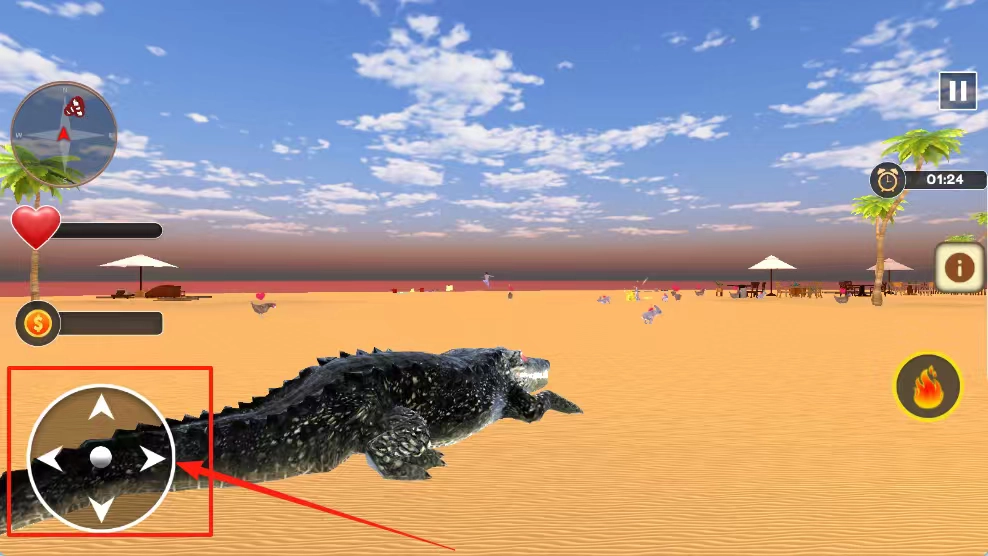 用左下角的虚拟摇杆操控鳄鱼的移动,留意右上角显示的剩余时间,要在规定时间内完成狩猎、规避危险等各类生存任务。