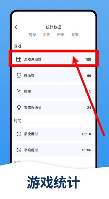 1. 查看统计数据:点击页面上的统计数据按钮,就能清晰查看游戏总局数、胜率、用时等信息,助力玩家掌握自身解题表现与进步情况。