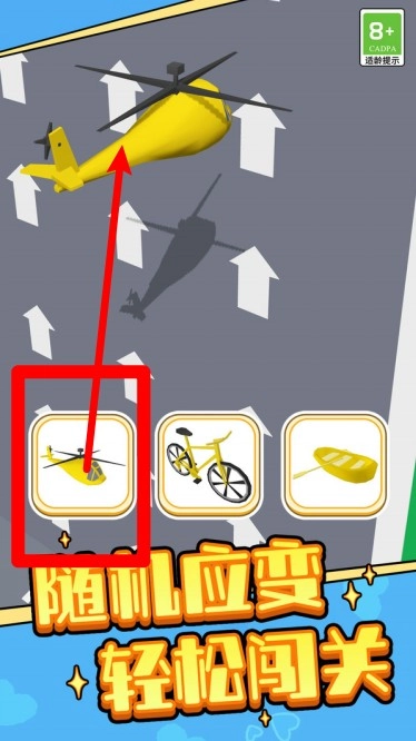 1. 点击左下角的图标切换至直升机形态,借助其飞行能力可越过空中障碍和上升通道,更轻松地穿越复杂地形,快速到达下一段赛道的起点位置。