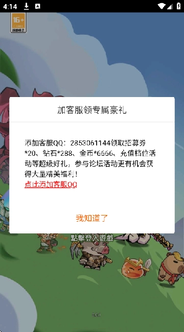进入游戏前添加微信客服,即可领取专属豪礼,助力您快速成长,领先他人一步。