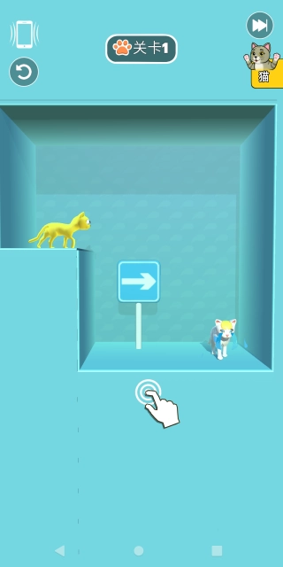 第一个关卡是新手引导关卡,玩家只需依照提示操作,就能让左边的猫咪顺利跳到右边的猫咪身边。