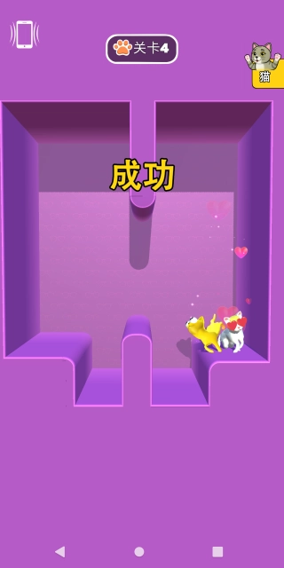 这是一款竖屏益智闯关游戏,核心情境围绕猫咪互动展开,关卡推进的目标是让雄性猫咪跨越重重障碍,最终与雌性猫咪相聚。