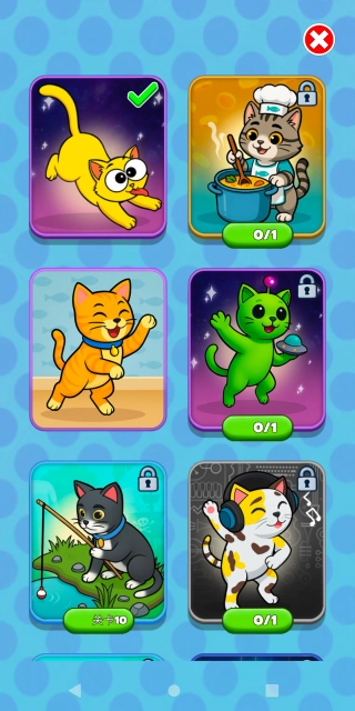 就像图里展示的那样,完成的关卡数越多,就能解锁各式各样的猫咪皮肤,挑选你心仪的猫咪形象继续挑战关卡吧!