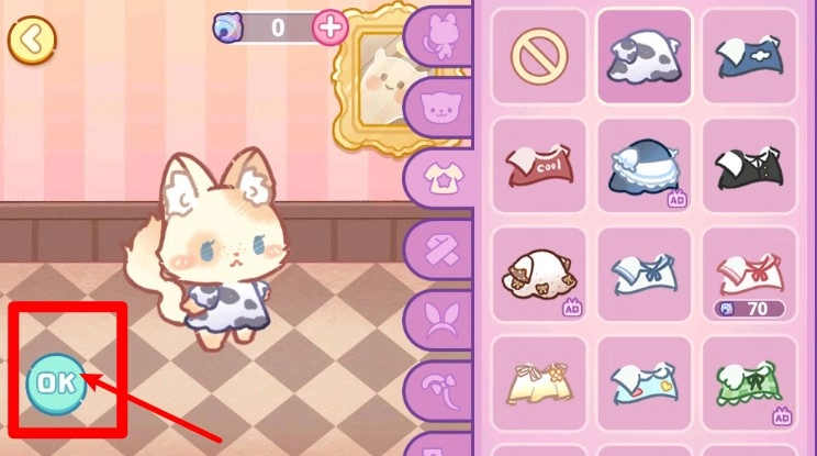 2. 完成搭配后,点击左下角的“OK”按钮,即可保存当前的猫咪造型,随后进入下一步操作或返回房间界面。