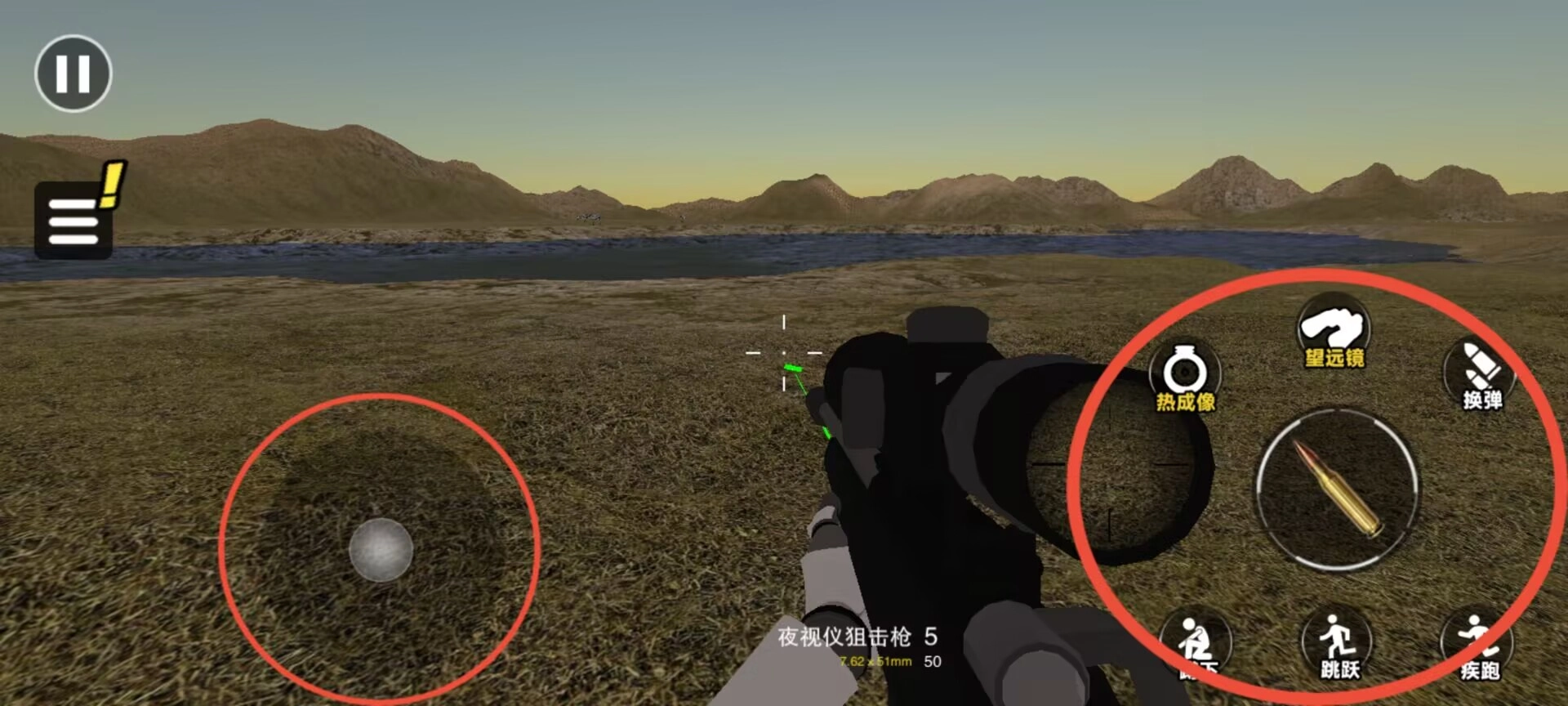 2、左下角的功能区域设有移动摇杆,同时包含热成像、望远镜、换弹、蹲伏、跳跃、冲刺等动作指令按钮。