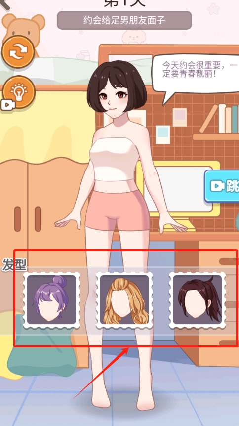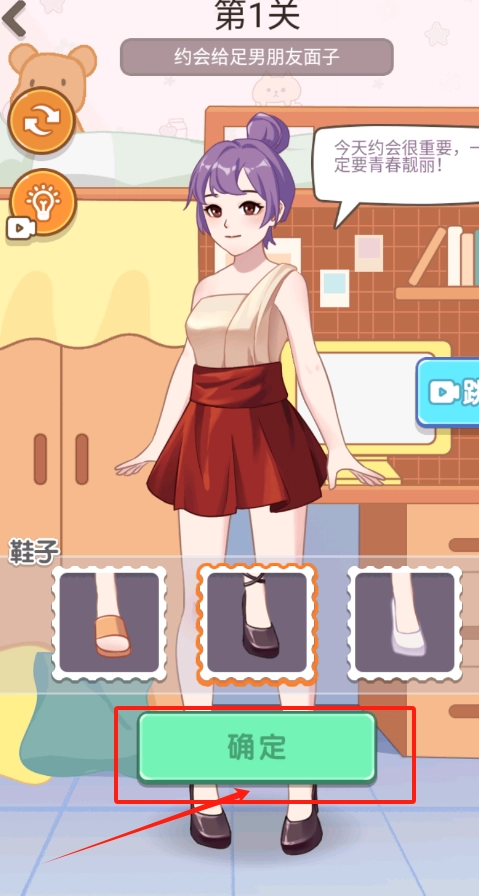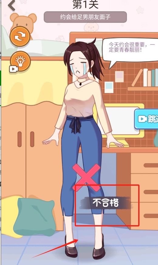 要是搭配没达到场景要求,比如不符合青春靓丽的标准,就点击重新选择按钮来调整造型,一直到通过关卡拿到奖励为止。