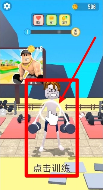 1. 点击“点击训练”按钮就能开启举重训练,只要持续点击角色就能提升属性,积累力量快速成长以解锁更多玩法内容。