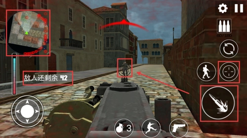 进入城镇、山丘等战场区域后,可通过射击键对敌人发起攻击,同时借助小地图来掌握敌军的移动方向以及剩余数量。