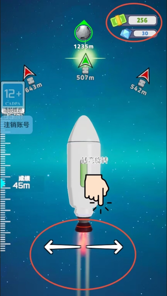2、开启飞行模式后,长按屏幕可实现加速推进,通过滑屏操作来控制航行方向,界面右上方会实时展示当前的货币储备情况。